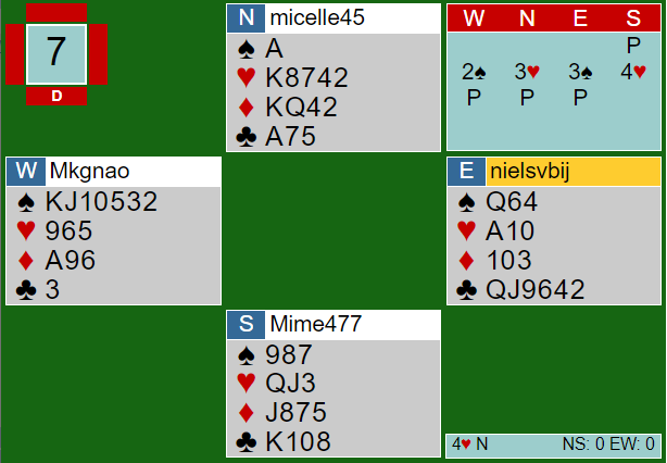 Mot 4 hjerter spilte Sælensminde (syd) ut kløver konge til esset. Spillefører dro ruter 9 i andre stikk, og den fikk seile til Saur sin dame. Vi kan jo se at Ø/V har et valg om hvor trumfdamen sitter, men motspillet her er likevel å spille trumf selv om det løser trumfen for spillefører. Nord har kontroll på ruteren, og Saur skiftet til trumf som er beste motspill. Det skiftet tok med seg syds dame og spillefører var inne hos vest. Spar knekt ble spilt og dekket av nords dame. Syd stakk østs konge med esset. Derfra kom nok en trumf, og spillefører begynte å gå tom for ressurser. Han kunne nok ha vunnet ni stikk, men satset på at ruteren skulle gi uttelling ved å spille ruter til knekten. Det er neppe riktig spilt. Om det er riktig (syd har for eksempel K-10-x) har syd gjort en feil som ikke dekket ruter 9 tidligere. Da han prøvde ruter til knekten stakk Saur med damen og spilte en tredje runde trumf. Da ramlet det helt sammen, og med kun 1-1 i trumf igjen fikk han ikke mer enn åtte stikk. Spillet ga 6 IMP da Geir Brekka spilte 2 hjerter med 9 stikk ved det andre bordet.
