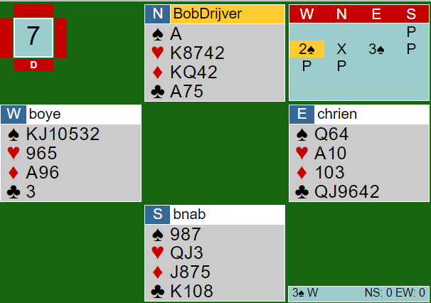 Ved det andre bordet doblet nord opplysende over Brogeland sin svake 2 spar, og øst (Bakke) høynet til 3 spar. Da var det ikke så enkelt for N/S, og det gikk pass rundt. I 3 spar ble det ni stikk, +140 til Ø/V, og 13 IMP til Bridge in Norway.