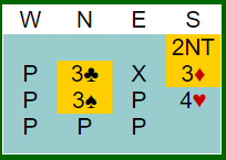 Vest er giver og passer før nord (Eide) åpner med 1 hjerter. La oss si du hopper til 3 ruter som sperr. Syd dobler (spar), og nord sier 3 grand. Hva spiller du ut?