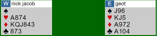 Makker Nick Jacob og jeg skal spille for Auckland/Northland sitt lag i åpen klasse.Tidligere denne uken prøvde vi oss på en treningsøkt uten at det gikk så bra. Her er et spill jeg følte det kunne (burde?) gått bedre: