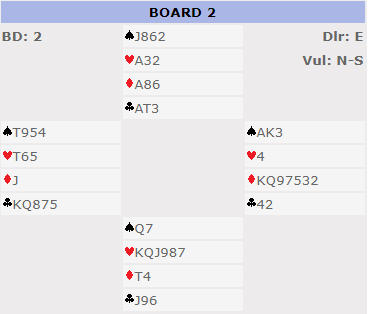 Selv spilte jeg enda en ruter i håp om at makker kunne ha en trumfbeholding som blir forfremmet. Det ble helt feil siden hele spillet så slik ut: