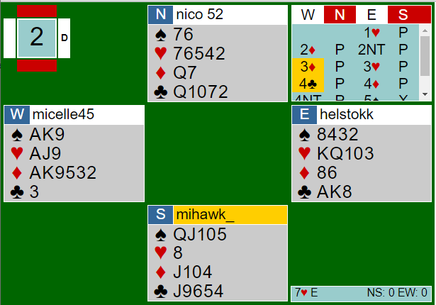 Uten å ha analyserte spillet veldig inngående ser det for meg ut som 7 hjerter kan vinnes med åpne kort. Men da må det spilles på eksakt denne sitsen.