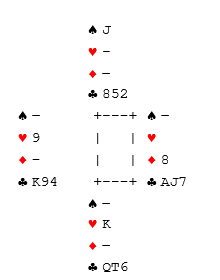 Dette kan bli sluttposisjonen både i 3NT og 6 ruter (NT) hvis det ikke kommer kløver ut og kløver en gang til idet syd er inne. La oss for eksempel si det kommer trumf ut mot 6 ruter. Idet kløver dame på et tidspunkt spilles kan ikke syd dekke med kongen, for gjør han det kan en finesse tas med nieren som gir det tolvte stikket. Så sluttposisjonen kan bli slik som i vårt diagram.