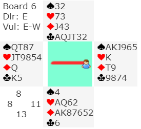 Kløverfinessen over vest var suksess, og det ga tolv enkle stikk, ett overstikk i 5 ruter som er bra. Makker spurte bekymret om vi burde ha vært i slem, men jeg sa «nei, det tror jeg ikke du behøver å bekymre deg over». Og ganske riktig, +420 for 5 ruter med tolv stikk ga hele 92 %!