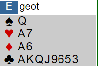 Spillefører må lese sitsen da syd kan kaste "lurt", men normalt setter motspillere seg på det de kan holde så lenge som mulig (her 2-2 i de to fargene). På kløver 3 fra øst må syd blanke spar ess, eller gå ned på singel konge i ruter som i så fall kan toppes ut. Holder han singel spar ess og ruter konge dobbel kastes en spar fra vest, så spar til syd som må avslutte fra K-7 i ruter, tolv stikk.