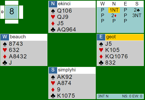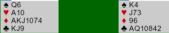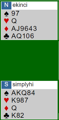 Å spille 6 kløver som er den perfekte kontrakten (ruteren kan godspilles med en stjeling) med tolv stikk ga 83%, og de som fikk tretten stikk fikk 93%. Så var det noen som var i 6 grand som er heldig da ruterfinessen må gå. De tre som spilte der fikk hjerter konge i utspill, og de tok ruterfinessen. Da blir det enten tretten stikk, eller to bet. Da det ble tretten stikk ble de belønnet med 96,5%. To par delte toppen for 6 grand doblet med tretten stikk (+1880).