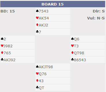 De som havnet i den uvanlige kontrakten 5 ruter vant den da det kun var en taper i hver av de røde fargene, for ruter satt fordelt 3-3 og hjerter 3-2.