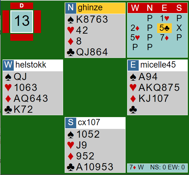 Omtrent en fjerdedel av Ø/V-parene fant fem til 7 ruter, men «Helgeness» sitt meldingsforløp var garantert det korteste. Nesten like mange som var i storeslem spilte utgang! Resten var i 6 ruter eller 6 hjerter. I lag LEVINE sin kamp var Ø/V ved det andre bordet i 6 ruter, og spillet ga 13 IMP i favør LEVINE.