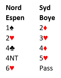 Kortene passet bra for det norske parets system. Svaret 2 ruter var utgangskrav, og over 2 hjerter kunne syd si 3 hjerter som var krav. Nord sa 4 kløver som viser kortfarge. Hvis han har en god hånd uten kortfarge kan han si 3NT, og hvis han har en helt minimums åpning kan han løfte til 4 hjerter. Godt kontroll!
