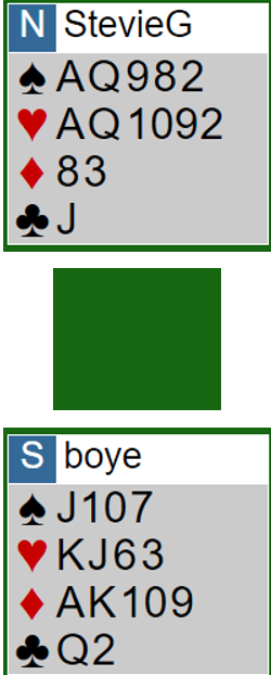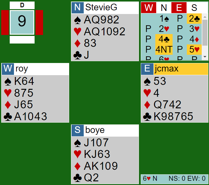 Da syd kontrollmeldte ruter gikk nord i 4NT - Key Card Blackwood, og syd viste to nøkkelkort (ruter ess og hjerter konge. Det eneste som fra nords synspunkt kunne vært et problem og ført til at slem ikke var god var hvis syd hadde tre små spar. Hvis er slem sannsynligvis avhengig av sparfinessen, men syd kan også noen ganger ha singel spar, eller spar konge.
