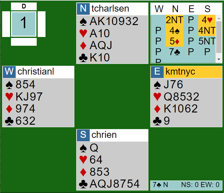 I turneringens aller første spill smalt våre motspillere til med 7 kløver uten nevneverdige problemer. Det var lett å se at storeslemmen ikke ville bli meldt ved alle bord, og valg av åpningsmelding med denne hånden hadde en del å si (spill 1, du er giver, ingen i sonen):