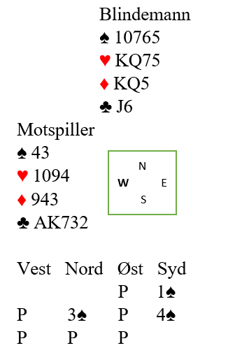 Idet det går ess-konge i kløver og en tredje runde kløver forsøker spillefører spar 10, det kan jo hende at øst om han har dobbelton kløver ikke har spar knekt. Men øst stjeler over med knekten og har beten i 4 spar med ruter ess.
