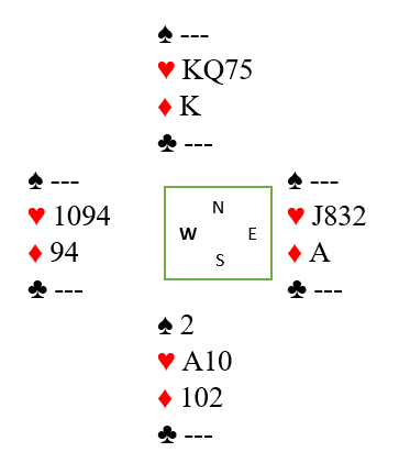 Nå tar simpelthen spillefører alle stikkene sine utenom hjerterne. Idet den fjerde kløveren og alle trumfene unntatt en er tatt ser det slik ut: