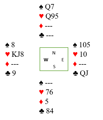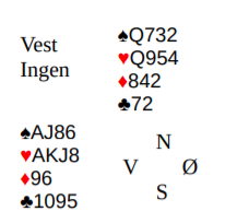 Makker spiller ut ruter konge til spilleførers (øst) ess. Han spiller spar konge og spar til esset, makker legger trumfineren og kaster i andre trumfrunde ruter 5. Så kommer kløver 10 som får seile til makkers konge (du legger syveren). Syd tar for ruter dame og spiller hjerter 3 til vests ess, spillefører følger med toeren. Det blir spilt kløver til esset og ruter 10 som syd dekker med knekten, og vest får stjele med knekten. Så følger spar 8 fra vest i denne posisjonen med de kortene du ser, dine egne og blindemann (vest):