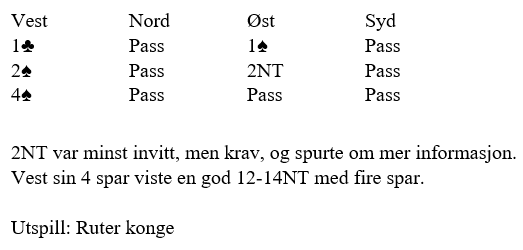 Det er klart at spillefører har fire spar og to hjerter (makker spilte hjerter 3, norske). Og han startet med tre ruter. Kløveren ser veldig ut til å ha vært AQJx hos øst fra start. Du må stikke med spar dame, men frir du deg da med trumf tar spilleføer resten.