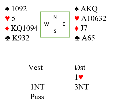 Men her blir det 3NT spilt av nord uansett, og øst spiller ut spar 4, fjerde høyeste.