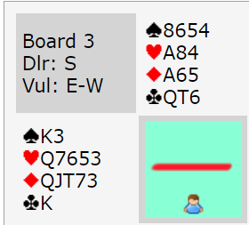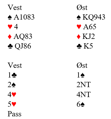 Vest vet med andre ord at øst må kunne stikke spar 8 og bør legge liten. Da spillet forekom så imidlertid vest ikke særlig lenger enn sin egen nesetipp i dette spillet og hoppet på med kongen. Og da skjedde akkurat det han fortjente: