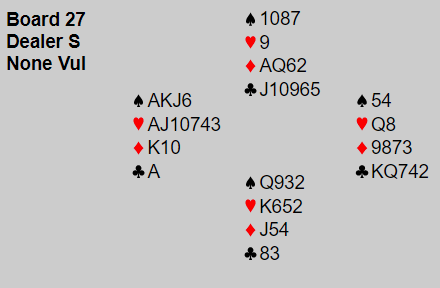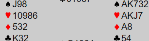 Syd spiller ut hjerter 3 til tieren, damen og esset. Det kan vel være en hjerterstjeling på gang her, så spillefører dengte ned A-K i spar. Det ble feil da det satt slik: