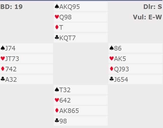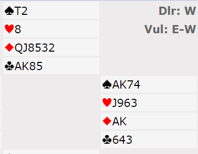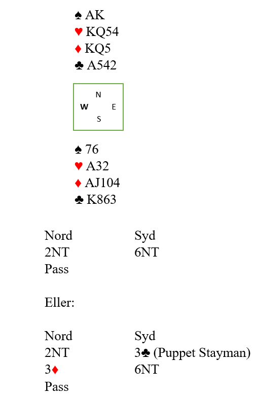 2NT viste 20-21. Noen vil kanskje være litt mer pessimistiske og kun invitere til slem med en kvantitativ 4NT (invitt til 6), men også da blir det slem fordi nord har maksimum. Det andre melde-alternativet med Puppet Stayman er fordi om nord har femkorts hjerter kan 6 hjerter på 5-3 tilpasning være en bedre slem enn 6NT. Nords 3 ruter viste en eller begge major (kun firekorts), og det var ikke syd interessert i. Så han avsluttet meldingene med 6NT. (om nord hadde hatt fem hjerter ville han sagt 3 hjerter på 3 kløver)
