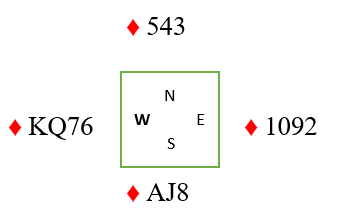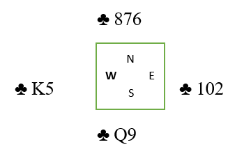 Dame-9 i kløver har blitt en perfekt saksekombinasjon, og Ø/V kan ikke lenger få mer enn ett stikk til i kløver.