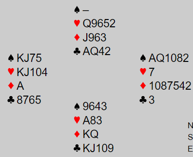 Nord visste det var voldsom fordeling og ville likt å spille ut trumf, men det hadde han ikke. Så han spilte ut en liten hjerter til esset. Nå hadde Ellingsen ikke så store problemer, han kunne kryss-stjele, og inkludert ett stikk for hjerter konge ble det greit å notere ti stikk, +590.
