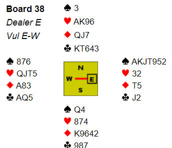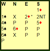 Ved det andre bordet åpnet VIEGO sin vest med 2 hjerter, og nord doblet. Øst høynet til 3 hjerter. Da var syd med til 3 spar, en fristende men nokså tøff melding. Er det så rart nord tror det står i storeslem nå? Jeg har litt sympati for nords avsluttende melding. Hele meldingsforløpet ble slik: