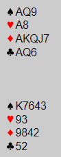 Hvis spar sitter 3-2 kastes altså en hjerter og en kløver hos nord, og om kløverfinessen går blir det en veldig "fet" +1540 til notering mot 520 i grand ved det andre bordet. Det ville i så fall gitt særdeles heldige 15 IMP til EFC HOLDING.