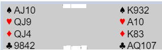 De som liker formiddagsbridge på nett har i lang tid hatt fordel av at Magne Vike med Livsnytere og Sissel Årflot Elvestad med Hyggebridgee har satt opp turneringer på BBO. Magne kunne ta nær ubegrenset påmelding som var fri og vanlig kom ca 100 par kl 10. Sissel måtte kjøpe plass så det kostet oss 1,5 dollar å spille kl 11.35. Men så «gikk det poliytikk eller noe i saken og Vike fikk begrensning på 40 par. Men da køen av bridgetrengende da overgikk mulighet for spill bestemte de seg nå å kjøre RealBridge i stedet. Det er en Facebook- gruppe for Hyggebridge og Livsnytere der man får tilsendt link for spilling. Første turnering gikk onsdag denne uka med 11 par (vil nok øke kraftig når klanen blir kjent med muligheten) og Terje Solle som makker fikk avslutte med en spilleprøve! Vest giver i gunstig sone.