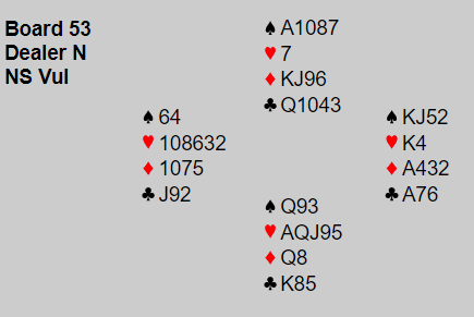 Hvis nord passer i åpning vil øst ved mange bord åpne med 1NT. Da spørs det om syd melder, hvis ikke vil vest overføre til hjerter. Det skjedde der Norge satt Ø/V, og Lars Eide (øst) fikk spille 2 hjerter udoblet. Han slapp unna med to bet etter et ikke alt for skarpt motspill, Finland N/S +100.
