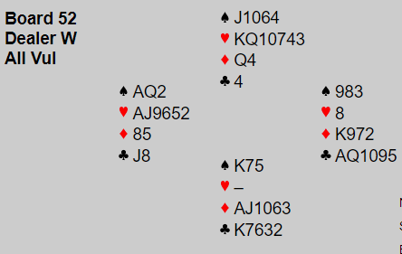 Dette ble ingen hyggelig opplevelse for den finske vest. Han skrapte sammen fem stikk, tre doblede i faresonen, +800 til Norge. Ved det andre bordet fikk det norske Ø/V paret spille 2 hjerter udoblet med -400, 9 IMP til Norge. Det var hjerterkontrakter ved fem av de seks bordene, men kun ett sted i tillegg til der Norge satt N/S ble kontrakten doblet (også 800). Færøyenes syd meldte inn 2 ruter over 1NT, og konkurrerte med 3 kløver i neste runde. Der ble det +200 til Ø/V i en slitsom 3 ruterkontrakt for syd.