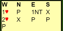 Igjen ble kontrakten 2 hjerter doblet. Denne gang utenfor sonen, men nå ble det fire doblede, og +800 til Norge i to spill på rad, begge ganger i 2 hjerter - en sjeldenhet!