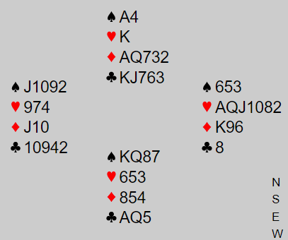 Det norske paret fant frem til en nydelig storeslem i ruter. Det er ikke noen dårlig 7 hjerter heller, men siden hjerteren sitter 4-1 blir det en trumftaper og bet der. I ruterkontrakten var det bare å ta ut trumfen, spille hjerteren fra topp og så stjele den fjerde hjerteren slik at den femte hjerteren blir godspilt, tretten stikk!