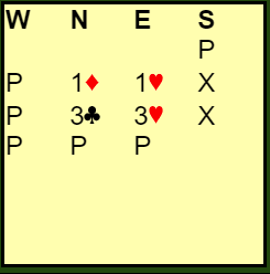 Jørgen meldte sprekt en gang til på tre-trinnet, og det var tross alt utenfor sonen. Syd doblet, og N/S lot øst spille den doblede delkontrakten. Det er sjelden noen god strategi å spille mot doblede delkontrakter helt uten trumf. Motparten kan ofte få mange stikk med ni-ti trumf til sammen selv om de ikke har mange honnørpoeng.