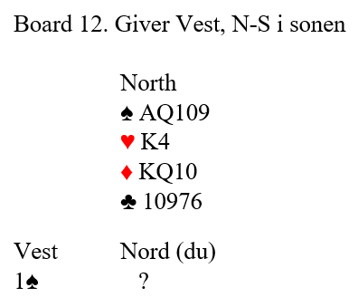 Tone Annette (V) åpnet med 1 kløver (3+) i gunstig sone, Anders gikk innpå med 1 ruter og jeg meldte 1 spar (4+ og 6+ hp). Steinar i Syd doblet, oppfattet som krav med hjerter bl.a. og Tone satset på 5- kort spar hos med og hoppmeldte til 3 spar. Nord og jeg hadde ikke mer å by på men Syd dro fram doblingskort med pass rundt. Ru D ble spilt ut, og jeg talte over 5 sikre stikk og en del muligheter i trumf siden vi begge hadde kortfarge. Men reise 4 stikk utenom syntes nærmest umulig. Bunn for -1 eller 2 og kanskje 300 ut truet! Men først skal det jo spilles.