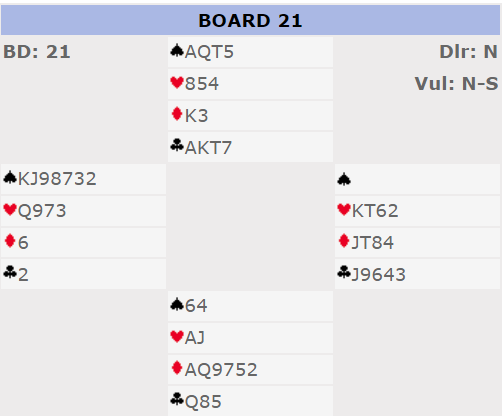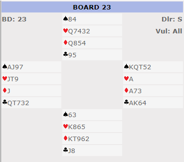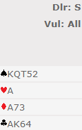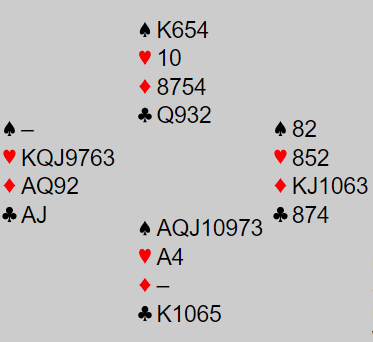 Nord spilte ut spar som neppe kan være riktig? Men han måtte uansett valgt mellom ruter eller kløver, og det blir nok et 50-50 valg i dette spillet som så slik ut: