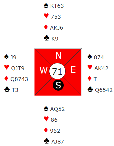 Dette ble en hardmeldt utgang. Nord spilte ut en sparhonnør. Om nord skifter til ruter må vest stjele og spille spar før han tar ut trumfen. Da har han kontroll og taper kun to sparstikk og ett i trumf siden trumfen er fordelt 3-2.