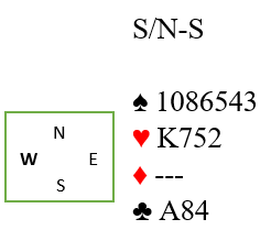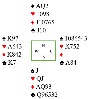 Det er det som er det viktige her, at vest er inne akkurat på dette tidspunktet. For hvis østs hjerter er størst i diagramsituasjonen er spillefører låst hos øst, og syd kan bare kaste ruter ess før han får betestikket i kløver til slutt. Men siden skviskortet vinnes hos vest er syd ferdig. Hvis han kaster ruter ess står kongen. Og hvis han holder på ruter ess må han ned på kun en kløver, og østs A-8 i den fargen tar de to siste stikkene.