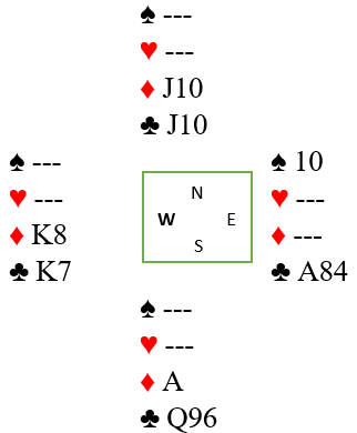 Om syd spiller ut hjerter, ruter eller kløver er det ti enkle stikk. En kløver kan trumfes først, og det tapes senere to stikk i trumf og ett i hjerter. Jeg er ingen stor tilhenger av trumfutspill fra singelton, men i dette tilfellet er det eneste mulighet for forsvaret for å sette press på spillefører. Om syd ikke spiller ut spar mot 4 spar, og nord ikke spiller tre runder trumf blir det enkelt siden østs tredje kløver kan trumfes. Selv om nord kan trumfe over idet kløver trumfes går det greit siden det i så fall er ett originalstikk i trumf. To trumftapere og en taper i hjerter blir alt som tapes.