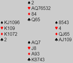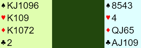 Men altså, som du ser sier denne computeranalysen at 4 spar alltid kan vinnes spilt av øst. Så det må være pga. at fra syd er de ikke noe truende kløverutspill. Østs ressurser i kløver gjør at kløver ut fra syd er velkomment for spillefører.