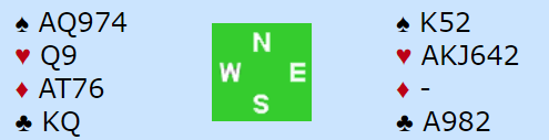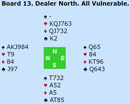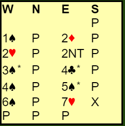Da vest (Grude) hadde hørt 2-over-1 GF fra makkeren, så 4 kløver cuebid over hans egen 3 hjerter som viste 5-5 endte det med en Key-Card Blackwood sekvens. Se på Grudes hånd når han får vite at makkeren har spar ess, hjerter ess og kløver ess. Rutertaperen går på kløveresset, og det vil dreie seg om sparfargen. Det måtte være spill for 7 hjerter, og det kan være ganske nedlegg og.