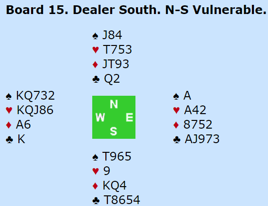 Til slutt satset han på det og ga opp det med en sparstjeling til. Han spilte trumf til esset, stjal en ruter og kunne ta ut nords siste fjerde trumf. Siden spar satt 4-3 stor resten, +1510 for vunnet storeslem!