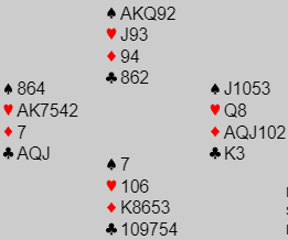Ved ett bord kom kløver i utspill fra syd, spillefører vant med knekten og tok hjerterstikkene. På et tidspunkt gjorde syd den feilen at han kastet sin ene spar. Da fikk han like etterpå for ruter konge, men det var det eneste stikket forsvaret fikk, nord satt litt trist og så på A-K-Q i spar som han ikke kunne få for. Pluss 690 ga ren topp til Ø/V.