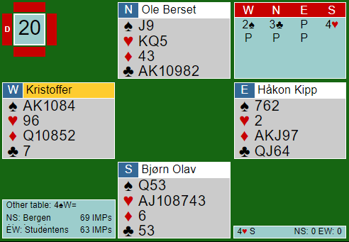 Bergen Ak fikk skikkelig stryk mot TopBridge i runde 3. De lå også under mot Studentenes BK i neste kamp, men snudde til seier bl.a. på grunn av dette voldsomme svingspillet: