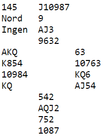 Bogen-Bogen var mer uheldige. Ikke bare meldte de 3NT mot dem, men spillefører tok det antall stikk som var mulig. Siden hjerter ess sitter foran, og ruteren sitter maksimalt snilt går det å få tak i elleve stikk her. Det gjørde Ø/V mot bronseparet som fikk hele -22 på dette spillet.