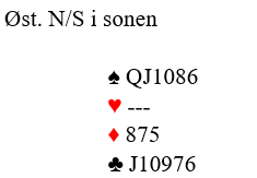 Da makker ikke hadde signalisert noe særlig i hjerter (med høy honør dobles normalt 3 hjerter) ble utspill der forkastet, hadde lyst til å serve ru J men var redd de hadde både A og D og kløver var også rissikabelt. Derfor spar ut (makker har nok noe der?) men da hadde Simonsen full styring. To stikk i hjerter kunne etableres og dermed var 11 stikk ren kabal. Resten av salen spilte utgang i spar med 11 men de fikk dermed topp for +460 mot de andres 450! Kløver ut holder kanskje Arild til 10 stikk?