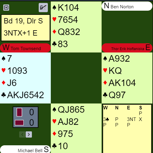 Det var litt spennende for "Hoffa" før utspillet, for med kun en stopper i hver av majorfargene kan 3NT doblet gå galt hvis vest ikke har A-K i kløver. Men å rømme er for feiginger, så det gikk pass rundt på doblingen.
