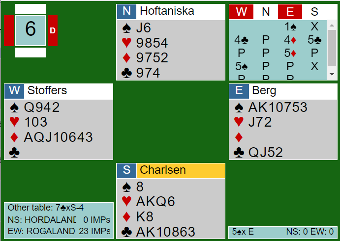 Charlsen (syd for Hordaland) visste at vest hadde kortfarge i kløver, og at øst sannsynligvis var renons i ruter. Dermed hadde han noen hjerterstikk i alle fall (kanskje til og med tre?) og muligens ett stikk i kløver. Idet Ø/V var i 5 spar doblet syd. Men Erik Berg (øst) hadde ingen problemer med å vinne den kontrakten, +850 til Rogaland.