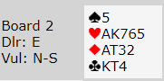 Jeg tenkte "intet hastverk" og sa 3 kløver, støtte og kravmelding. Med svake kort går vi her via 2 NT. Makkers melding nå var overraskende, 4 spar!