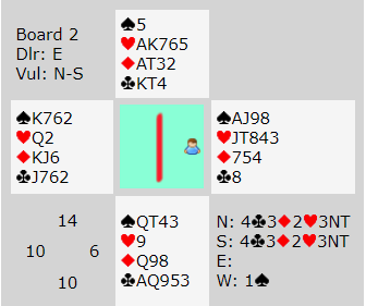 Vi bruker 4 spar som Key Card Blackwood (i stedet for 4NT) når hjerter, ruter eller kløver er trumf. Så hans 4 spar må være KeyCard me dkløver som trumf? Men da må han jo være monstersterk, ellers kan han ikke gå på sånn som det der direkte over 3 kløver som dog er krav, men ikke sleminvitt nødvendigvis? Han må altså ha enorme monsterkort.
