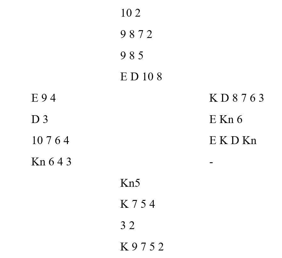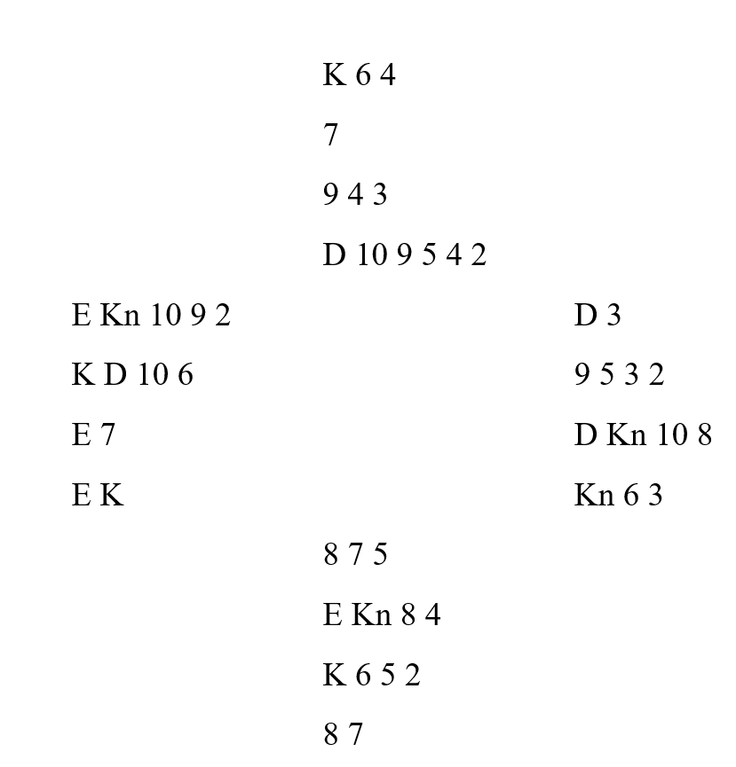 Du vinner utspillet i bordet og spiller spar mot knekten. Hvis knekten vinner er du allerde halvveis i mål. NÅ skifter du fot til hjerter mot dama. Da er du faktisk i mål når sitsen er denne: